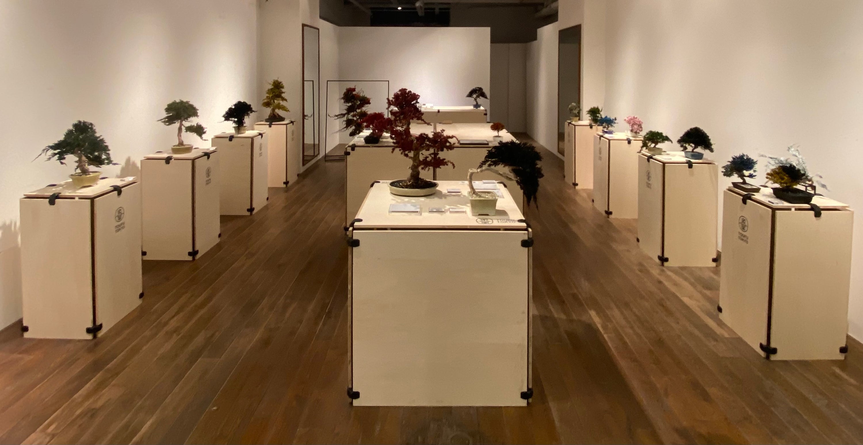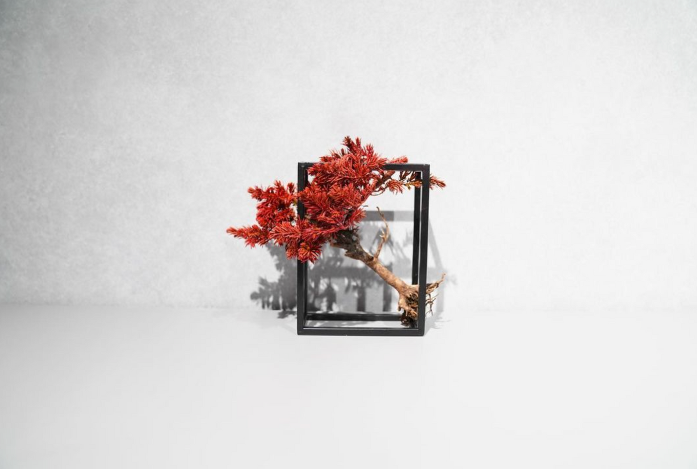 さらに、独自でドライ化した別の葉や枝葉を付けて、元の盆栽の歴史に斬新な魅力を加えて作り上げています。